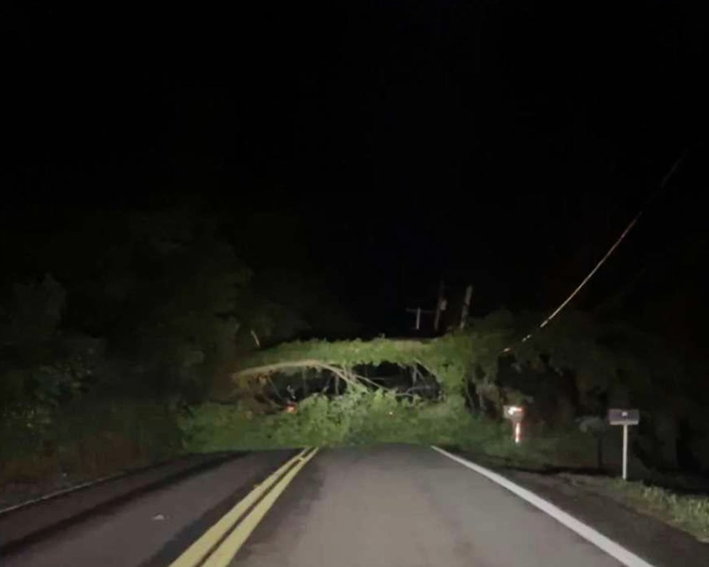 A tree covers Route 8-19 in the middle of a storm.