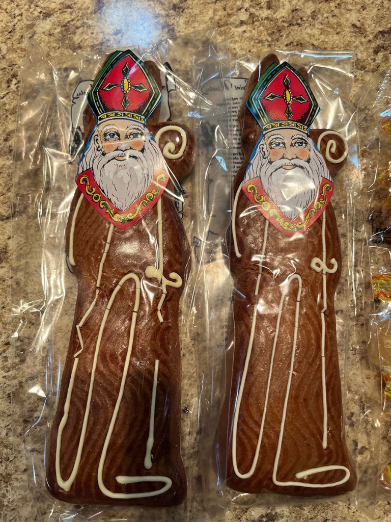 While they sleep, Saint Nicolas will put candy into the shoes of the good children, and then Père Fouettard—Father Whip—will drop coal in those of the bad children. Sometimes, he even whips naughty kids with his bag of sticks.
