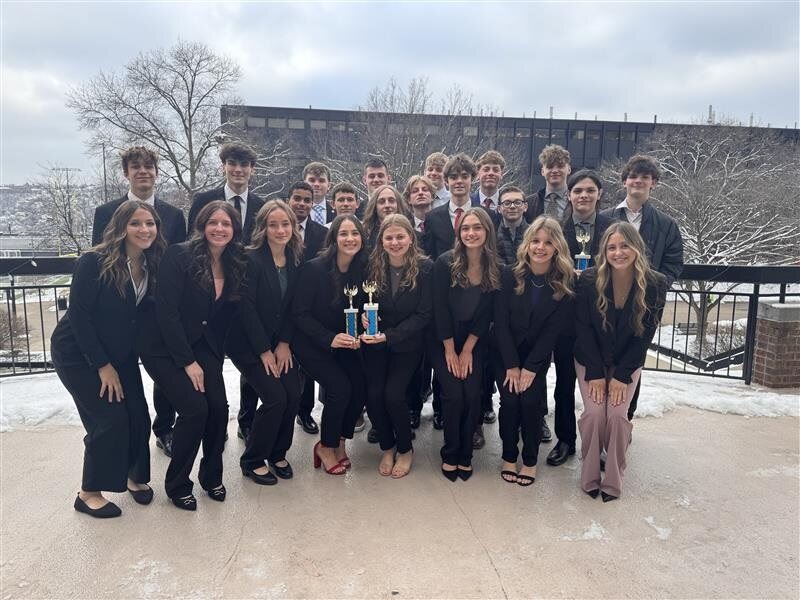 DECA Club students pose outside of Duquesne’s business building after their district competition.