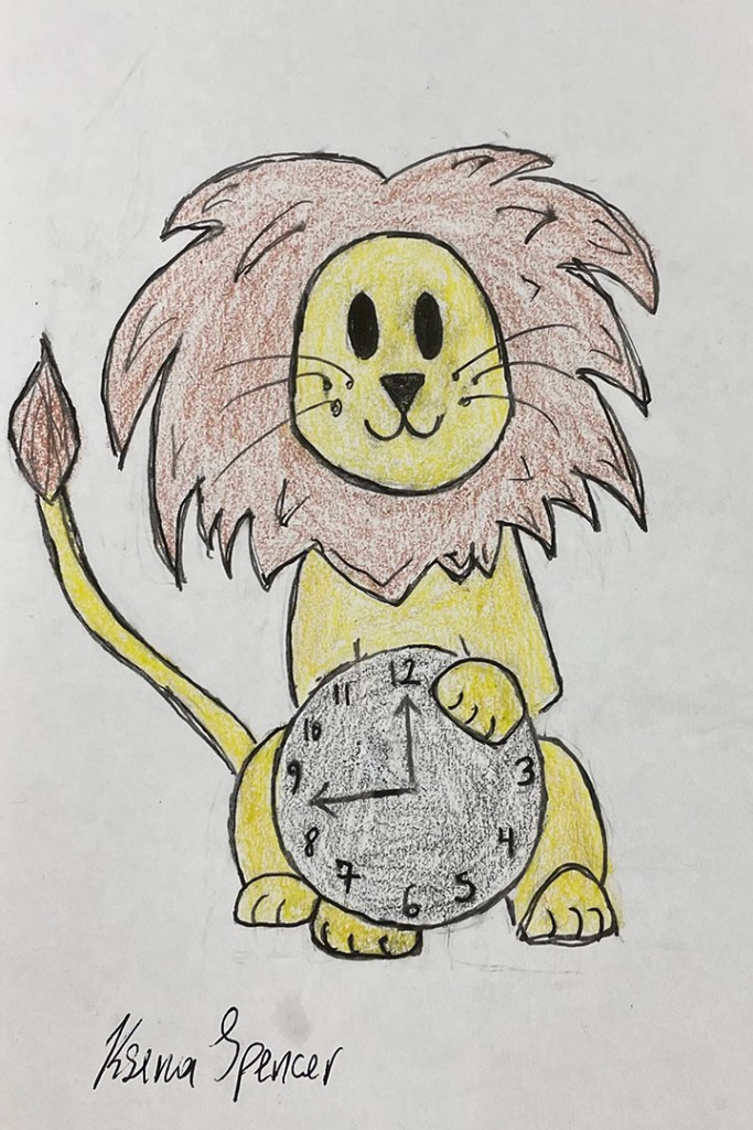 Lion holding a clock that is showing the time of the dismissals for the Middle and High School.