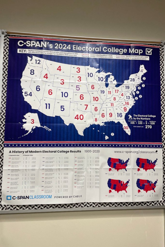 A poster of an electoral map with results from 2020 that hangs in Mrs. Simone’s room.